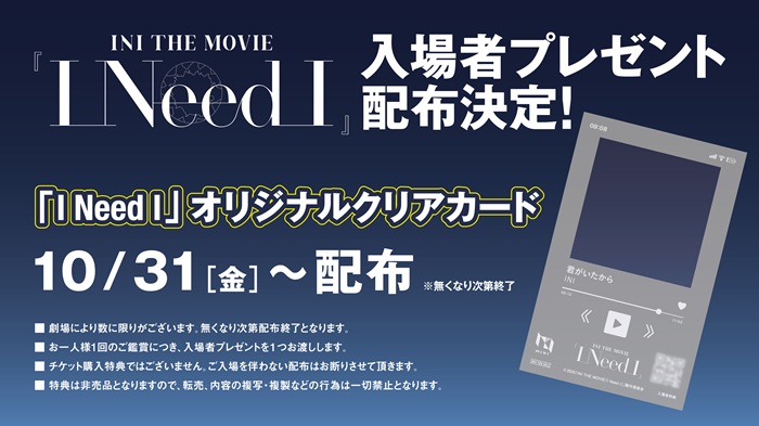 このたび、10月31日(金)に全国公開となるINI初のドキュメンタリー映画「INI THE MOVIE『I Need I』」の公開を記念して、公開日の10月31日(金)より、入場者プレゼント「『I Need I』オリジナルクリアカード」を配布することが決定しました。