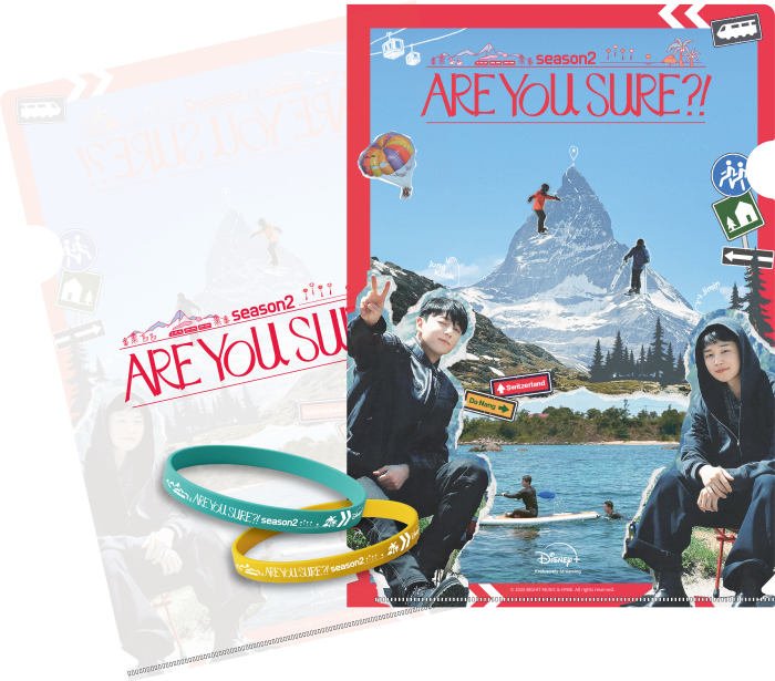 スタンプを集めながらポップアップ内の各スポットを周る「I’m so sure!」トラベルスタンプラリーや、”ふたりの旅はいつも予想外”をテーマに当てた色のオリジナルラバーバンドがもらえる「Are You Sure?!ルーレット」企画のほか、ふたりの思い出フォトのパネル展示や、来場者がふたりと旅した記念を残せるフォトスポット、作品への想いやふたりへのエールなどを書き込んだステッカーを貼ることで来場者全員でこのポップアップだけのポスターづくりを体験できるメッセージボードなど、『Are You Sure?!』フェスでしか体験できない特別なアクティビティをご用意しています。来場者にはここでしか手に入らないオリジナルA4クリアファイルのプレゼントも!ぜひポップアップでふたりの旅を一緒に体験しよう!