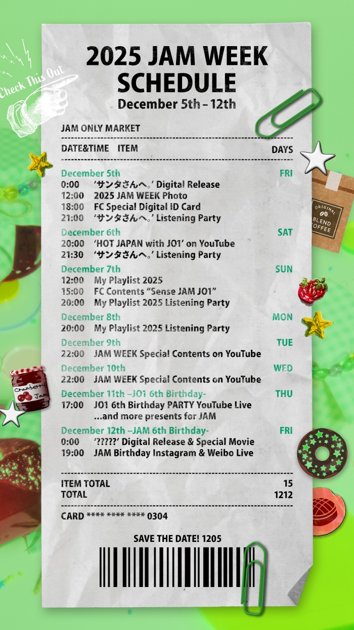 さらに、12月11日(木)に結成6周年を迎えるJO1。これを記念し、JO1とJAM(ファンネーム)の特別な日を祝う毎年恒例の企画「JAM WEEK」が、今年も実施されることが発表されました。5日(金)0:00には、昨年のツアーでサプライズ披露され、メンバーの川西拓実が作詞・作曲を担当し、本日より放映中の「ほっともっと」TVCMタイアップソング「サンタさんへ。」がデジタルリリースされるほか、さまざまな特別コンテンツが展開されます。