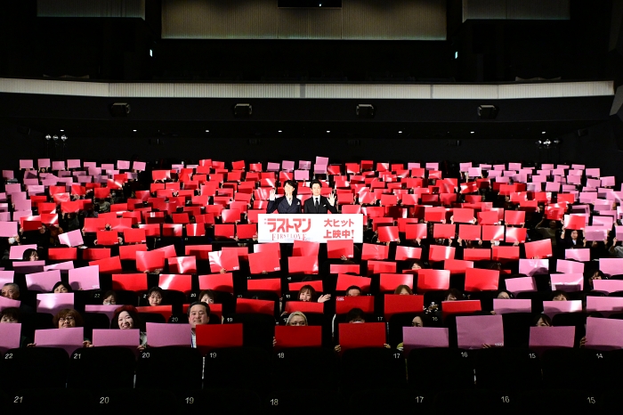 この日は赤坂のTBSから『ラストマン』スペシャルラッピングカーに乗車して本劇場に移動してきた二人。車中ではインタビューを受けながら深い話をしたそうで、福山は「18歳の頃に上京して初めてのクリスマスを一人で過ごしていたけれど、50歳を超えてこういうお仕事をさせてもらえるとは。こんな未来は想像していませんでした。幸せな気持ちで初日を迎える事が出来ました」としみじみ。続けて「映画、泣けましたか?笑ってしまうところもありましたか?」と観客に問いかけると、会場からは大きな拍手がおき「いい映画の証拠です!」と手応えを感じてた。