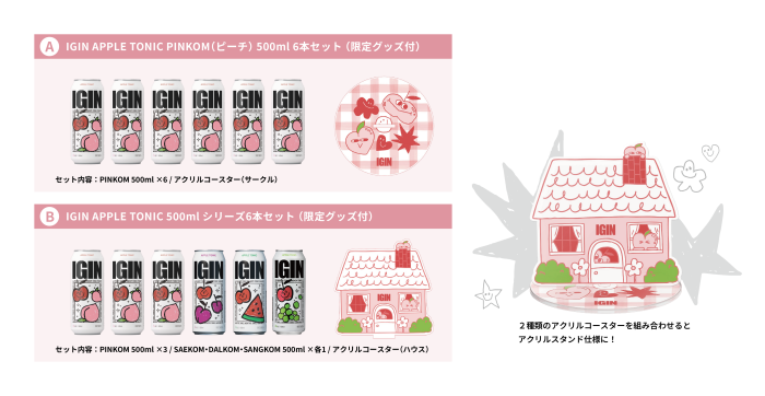 新作を思う存分楽しむ〈PINKOM(ピーチ) 6本セット〉と、IGIN APPLE TONICシリーズの全ての商品を一度でコンプリートできる〈シリーズ 6本セット〉の2パターンご用意。