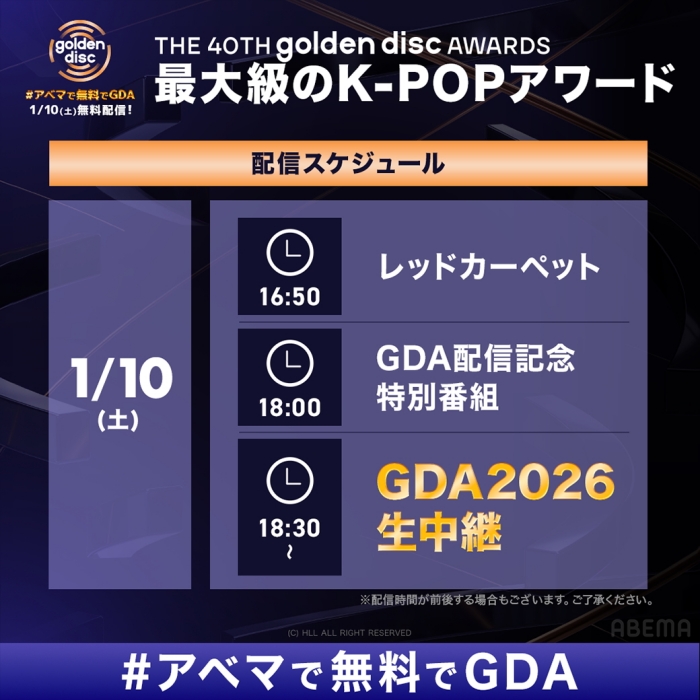新しい未来のテレビ「ABEMA(アベマ)」は、2026年1月10日(土)の夜6時30分より、最大級のK-POPアワード『第40回 ゴールデンディスクアワード』を日韓同時・国内独占無料生中継いたします。また、レッドカーペットの様子は午後4時50分より無料生中継いたします。
