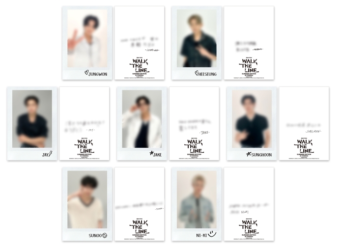 注目の第一弾は、「ポラロイド風ビジュアルカード(複製手書きメッセージ入り/全7種ランダム)」(100mm × 148mm)。前面はメンバーそれぞれのポラロイド風ビジュアルカード、背面には、メンバーの複製手書きメッセージがデザインされています。ENHYPENからENGENEへ、特大の愛がこもったグッズとなりました!