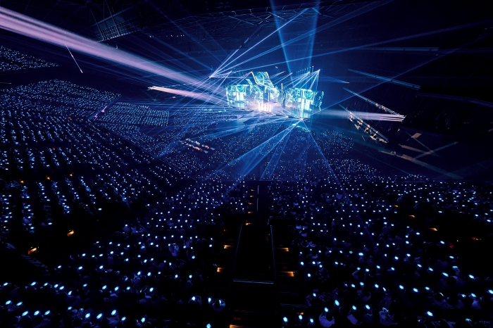 「光が届く場所へ、共に。僕たちはまた前に進む」——その言葉と連動するように、白い衣装に身を包んだメンバーが青く仄めく会場に舞い戻る。光のチェーンや檻、ボックスに閉じ込められていたメンバーが次第に解放されていく演出は幻想的で、まるで一編の映画を見ているかのようだ。