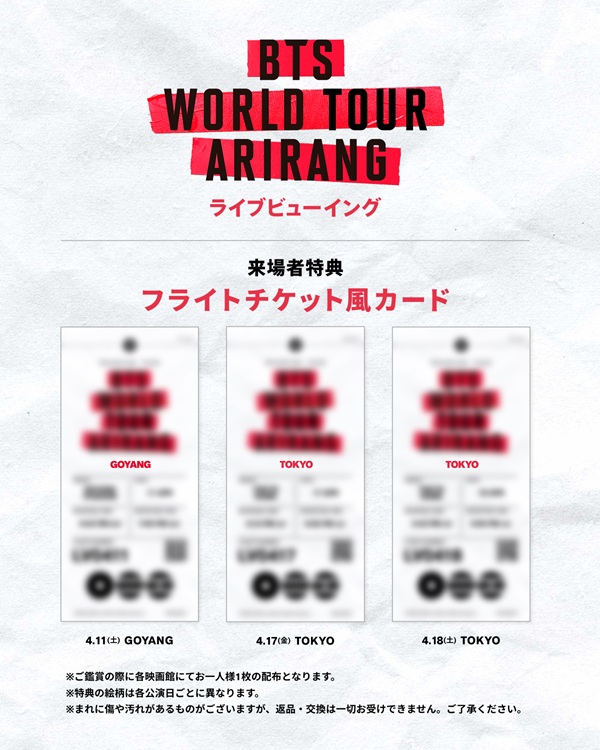 - BTSによる自身最大規模のワールドツアーが遂に開幕! BTS WORLD TOUR ‘ARIRANG’全国の映画館で生中継!《ライブビューイング限定》来場者特典の詳細が解禁!