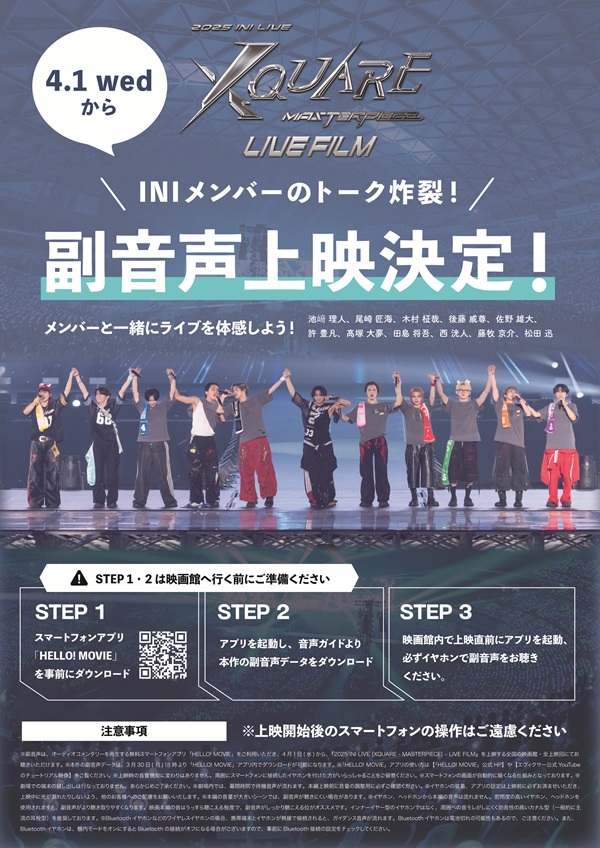 【副音声付き上映】は4月1日(水)より実施。迫力あふれるライブ映像を大スクリーンで堪能できるのはもちろん、INIメンバーのここでしか聴くことのできないスペシャルトークを、副音声で楽しみながら鑑賞することができる特別な上映となっています。まるで、INIと一緒にライブを観ているかのような新しい感覚を味わいながら、観るたびに異なる楽しみ方ができるライブ鑑賞体験が実現しました。なお、副音声はスマートフォンアプリ 「HELLO! MOVIE」 をダウンロードすることで、どなたでもお楽しみいただけます。また、【発声OK!応援上映】は、4月9日(木)に北海道・東京・愛知・大阪・福岡の5都市5劇場にて実施。映画オリジナルで再編成されたライブ映像を歓声やペンライトとともに体験できる本上映では、劇場という空間でありながらも、ライブ会場さながらの自由なスタイルで本作をご覧いただけます。それぞれ異なる魅力を持つ上映形態で本作を多角的にお楽しみいただける機会となりますので、お好みのスタイルで本作ならではのライブ体験を存分にご堪能ください。