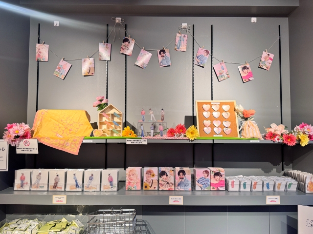 さらに、カフェオリジナルアイテムが並ぶエリアには、ここでしか手に入らない春らしいデザインのハート缶バッジやバンダナ、蓋付きマグカップなどの商品を実際に手に取ってご覧いただくことができます。是非この機会にご確認ください!