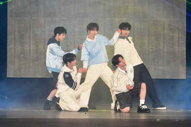 続いて、4月8日(水)にリリースされたばかりのデビュー曲「’Mi*light(ミライト)」をパフォーマンス。IOが「練習生時代の気持ちや、仲間と共に、新たなスタートラインに立つ、まさに「今」の僕たちの想いを込めた」と語る同曲では、先ほどとは一転、キレのあるダンスと5人の息が合ったエネルギー溢れるパフォーマンスを披露。イベントの幕開けを華やかに飾るとともに、武道館へと続く確かな一歩を刻みました。